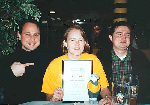 Die zehnte Station führt zur Verleihung des Pokals für den 2001 erstmals gewählten Buben des Jahres: Alison! Hier präsentiert sie ihre Urkunde und den Pokalbuben (in gelb). Nicht in gelb ist links Marc zu sehen, der aufgrund eines technischen Versagens um die zum Mitsieg entscheidende Stimme gebracht worden war. Im Gegensatz zu Loddar erwies er sich jedoch als fairer Verlierer und zeigt auf diesem Bild, wer verdient gewonnen hat. Auch noch im Feld des Fingerzeigs findet sich auf der rechten Seite der Webmaster, der mit nur einer ungültigen Stimme bei der Wahl Letzter wurde. Aus seinem Kopf wächst aus nicht geklärter Ursache eine Säule, die wie ein Dortmunder Socken aussieht. |