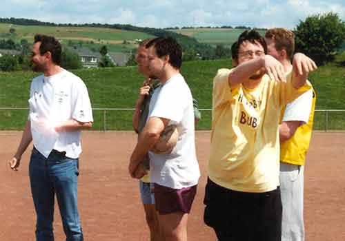 Im Sommer 1999 hat Bernhard die Sololaola erfunden und auch gleich zur Perfektion gebracht. Hier sieht man ihn damit die allerdings schon längst verlorenen Buben auf dem Spielfeld vor ihm anfeuern, während Herbert, Loddar, Martin und Christian dem Sportwart entgegen blicken, der ihnen den Trostpreis (einen halben Kasten Bier) bringt. Damit er nicht als Bubenteamchef erkannt wird, zieht sich Herberti gerade sein neues T-Shirt aus (siehe Station 1). |