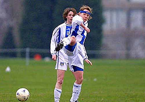 Im Jahr 2001 holte Herberti Verstärkung aus der englischen Profiliga zu den Buben. Wahrscheinlich haben ihn die schönen Fotos in Alisons Bewerbungsmappe von ihr überzeugt: dies hier ist ein Beispiel daraus. Das Foto stammt von einem typisch englischen Duathlon - für das anschließende Radfahren trägt Alison bereits eine blaue Fahrradhose. Unvergessen bleibt uns allen auch ihr Siebenmeter gegen Markus im Turnier der Luxemburger von 2001. Über den Siebenmeter des Webmasters bei selbiger Gelegenheit decken wir an dieser Stelle aber lieber den Mantel des Schweigens. |